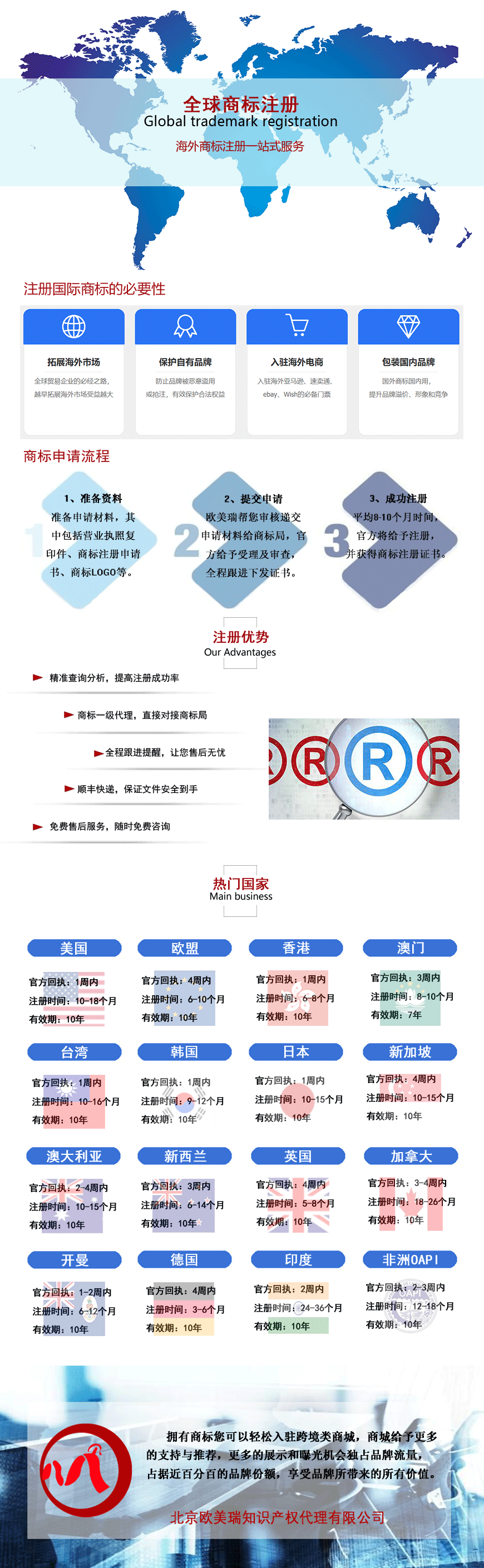 歐美瑞國際提供全球商標(biāo)注冊,免費咨詢。主要經(jīng)營美國商標(biāo)注冊、歐盟商標(biāo)注冊、馬德里商標(biāo)注冊、中國商標(biāo)注冊、英國商標(biāo)注冊、德國商標(biāo)注冊、加拿大商標(biāo)注冊、新加坡商標(biāo)注冊、澳大利亞商標(biāo)注冊等等。